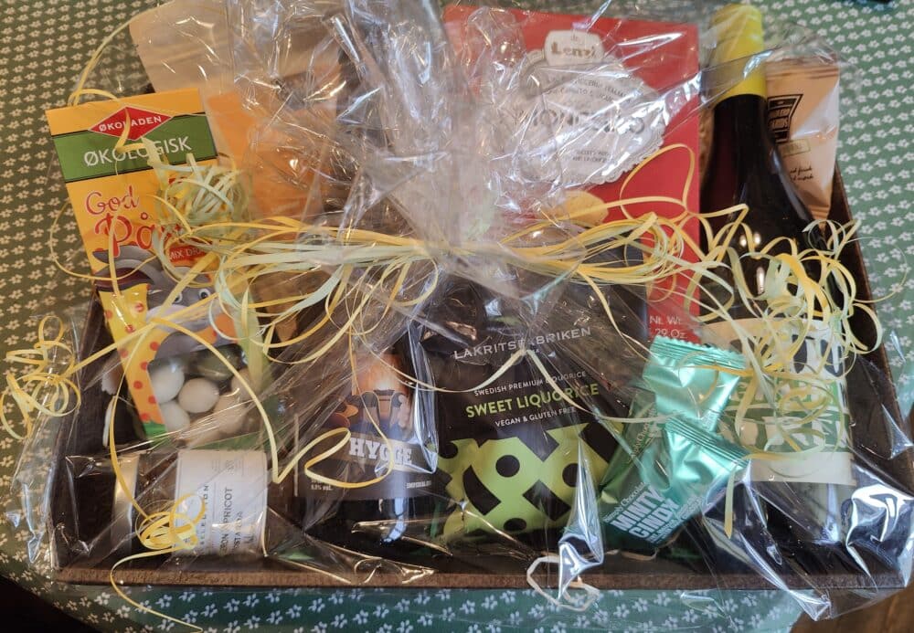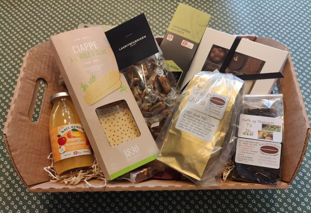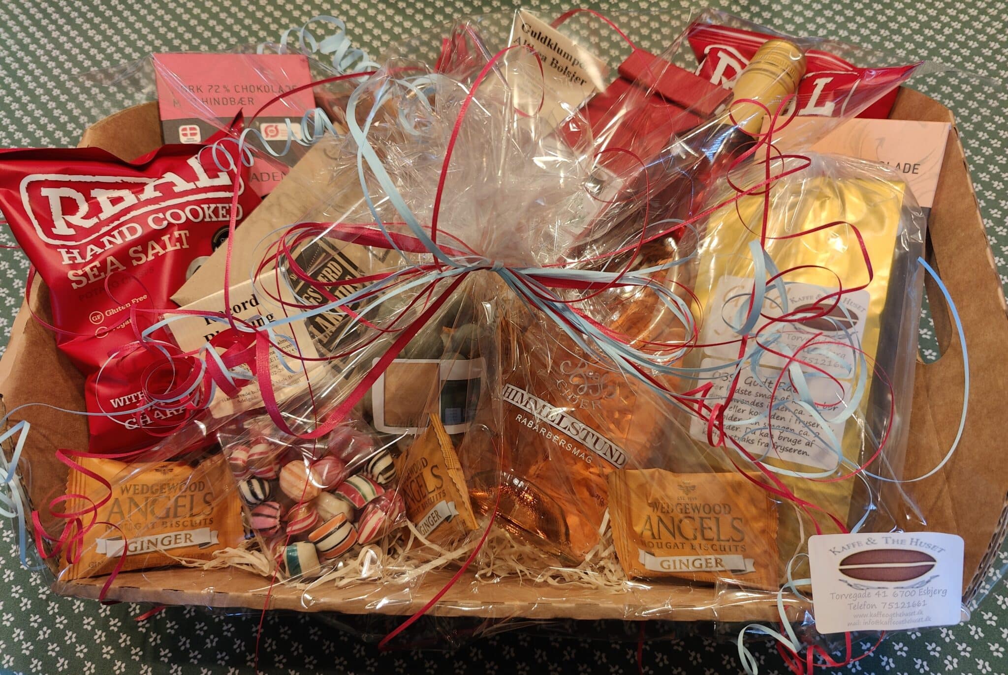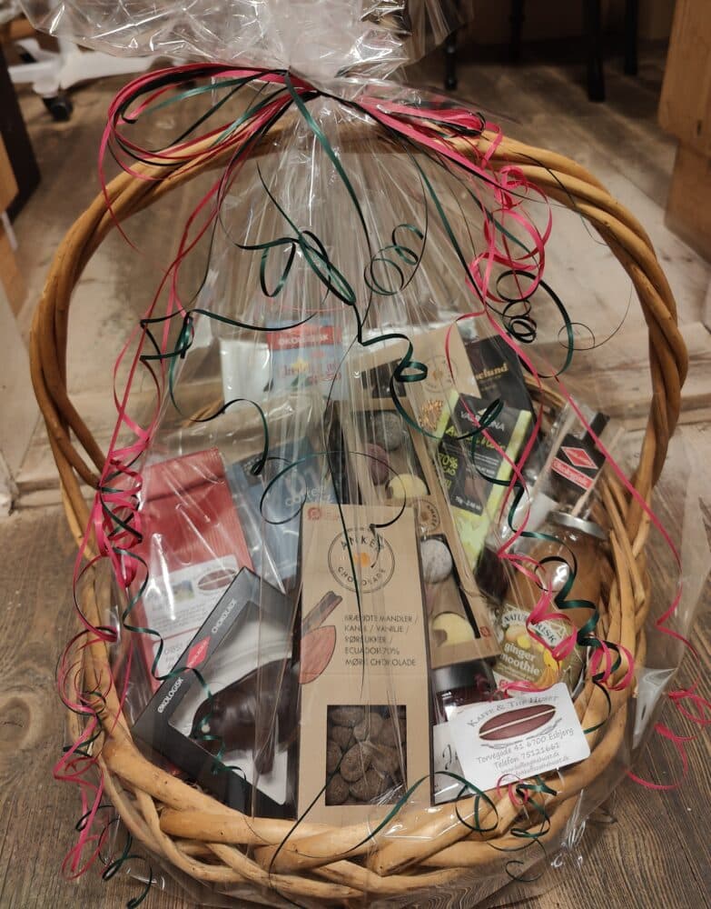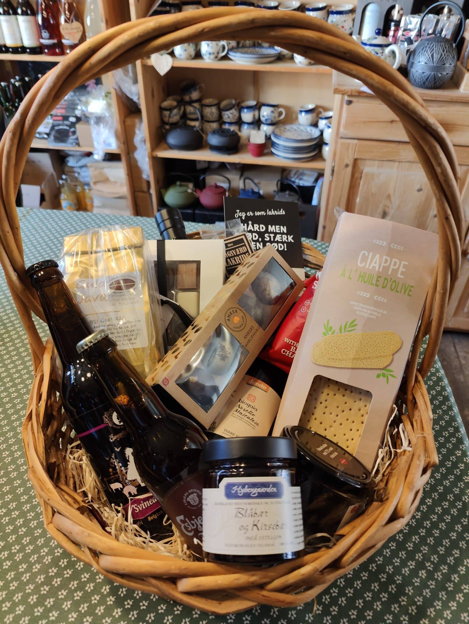 Vi laver gerne en gavekurv, efter dine ønsker, herunder ses eksempler.